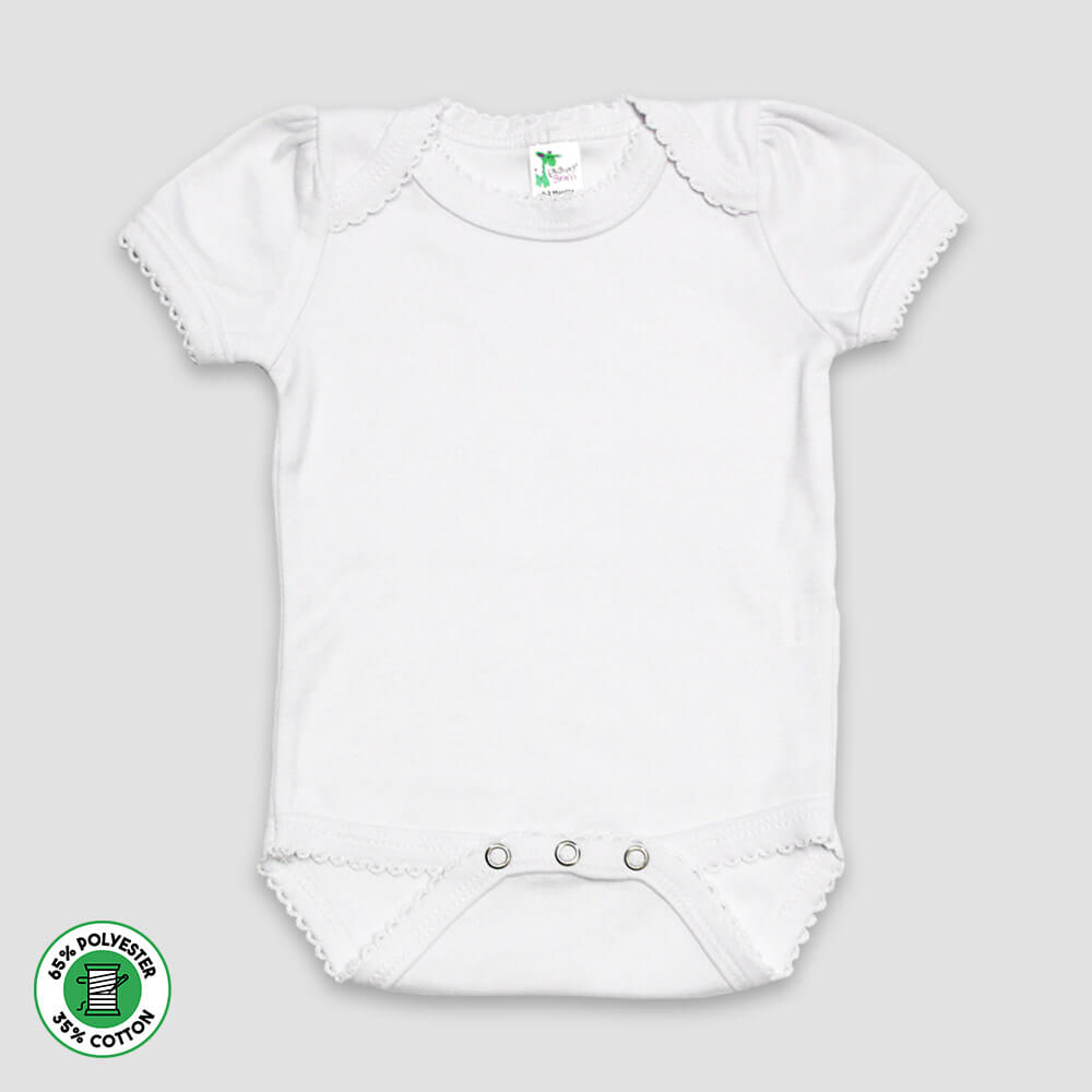 Our blank baby girl bodysuits are a must-have for custom apparel businesses, boutique owners, and promotional product companies. The polyester/cotton blend ensures smooth, even printing results, while the scallop trim creates a boutique-quality appearance that parents love. Whether you’re producing personalized baby gifts, retail boutique inventory, or wholesale custom orders, these white bodysuits offer both premium quality and endless creative possibilities. Their wholesale availability makes it easy to stock up for your next project or large order.