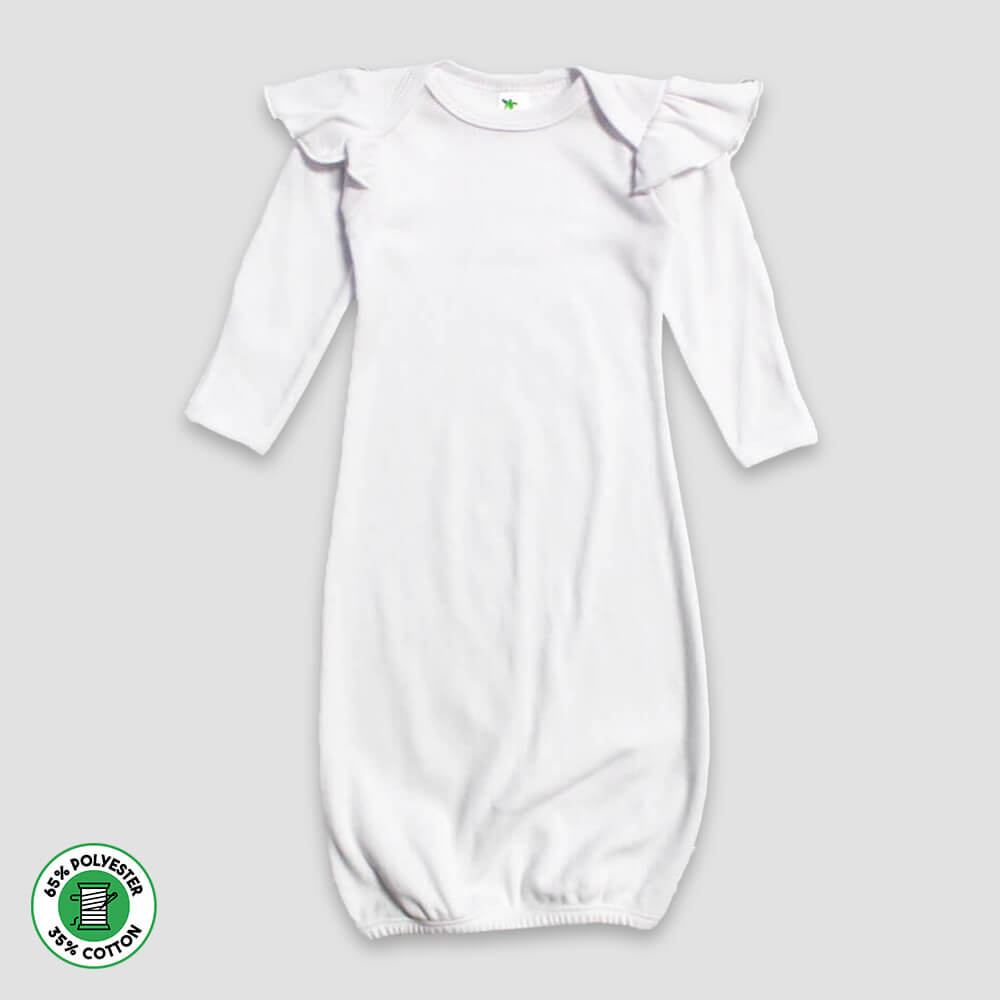 Bring comfort, style, and print-ready design together with our Baby Girl Nightgowns with Flutter Angel Long Sleeves—a must-have for decorators, resellers, and custom apparel professionals. Made from a premium 65% Polyester / 35% Cotton blend, these soft and breathable baby sleeper gowns are designed to offer both comfort and printability. Their airy construction helps regulate body temperature, reducing the risk of overheating, a critical factor in safe infant sleepwear.