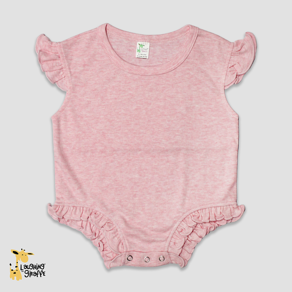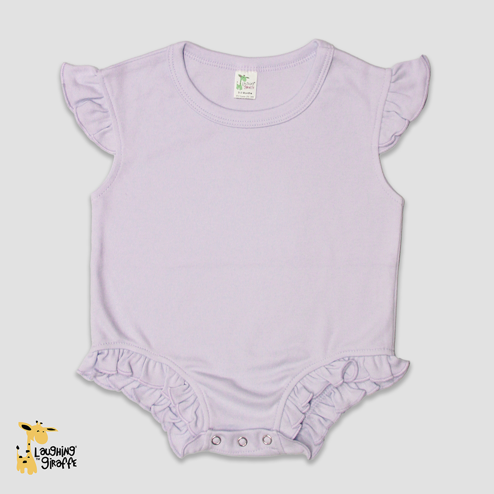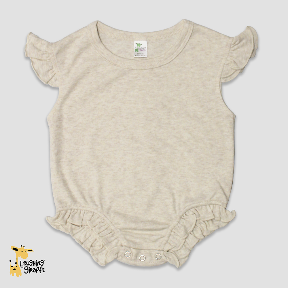 The flutter sleeve detail adds a sweet, playful touch, while the bubble silhouette gives babies plenty of room to move freely. Snap closures at the bottom make diaper changes quick and hassle-free, which parents and caregivers will love. With its neutral tone and blank design, this romper is a versatile canvas for embroidery, screen printing, or heat transfers, making it a must-have piece for decorators, resellers, and brands looking to create standout designs.
