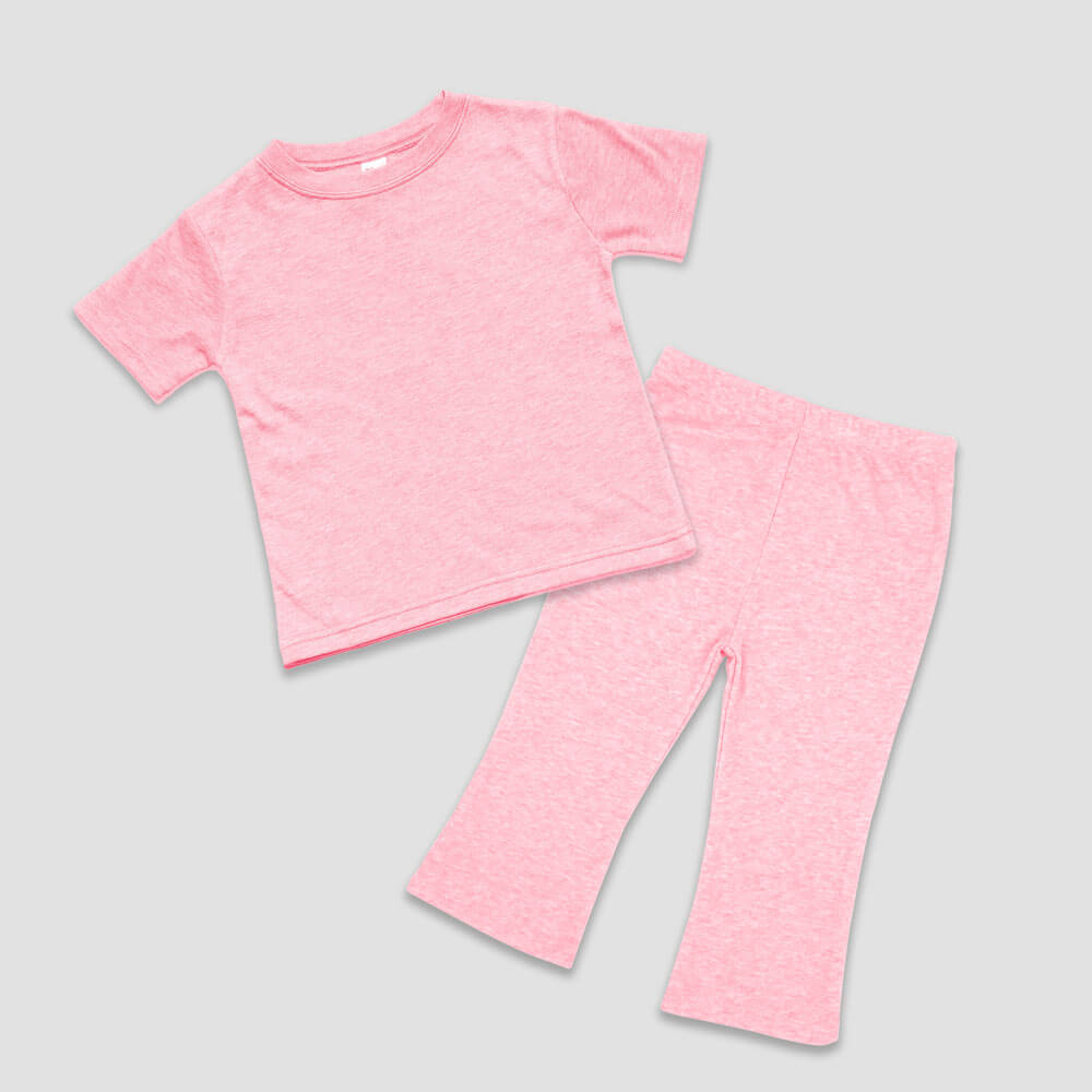 Elevate your toddler’s wardrobe with our stylish blank toddler pants and t-shirt sets. Our toddler flare pants and short sleeve t-shirt sets are perfect for girls! Crafted from a premium 65% polyester and 35% cotton blend, this set offers a silky smooth feel that’s gentle on your little one’s skin, making it an ideal choice for all seasons.